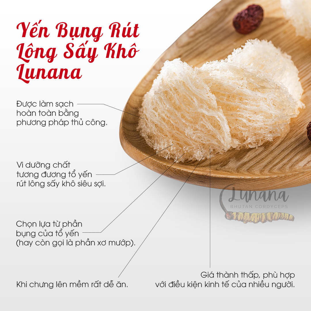 Yến bụng rút lông sấy khô Lunana được chọn lựa từ phần bụng yến của tổ yến hay còn gọi là phần xơ mướp, được những người thợ thủ công tay nghề cao, dày dặn kinh nghiệm làm sạch hoàn toàn thủ công, giữ nguyên giá trị dinh dưỡng của tổ yến.